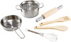 - Includes 7 high quality pieces made from wood and metal: pot, saucepan, rolling pin, spatula, wooden spoon & a metal mixer